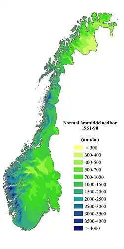 While the coast of West Norway is among the rainiest in Europe, East Norway is largely in the rain shadow and relatively dry. In fact, northern Oppland is among the driest areas in Europe (comparable to dry areas in Spain and Greece). The interior of North Norway also obtains very little precipitation. Longyearbyen in Svalbard gets less than 200 mm precipitation per year similar to Almeria in Spain.