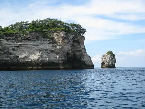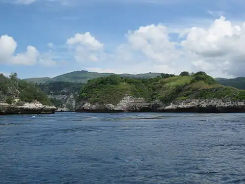 There are many quiet and secluded white sand beaches along the north and northwest coasts of Nusa Penida. Other geographical highlights include limestone caves, spectacular high coastal cliffs with karst formations and offshore pinnacles in the south and east, and rugged hill tops in the high centre.
