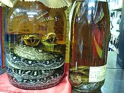A notorious version of awamori is habushu (ハブ酒), with an entire venomous Okinawan pit viper (habu) pickled in the bottle, often by inserting it while it's still alive. At a minimum of ¥10,000 for a bottle, it's expensive and nobody drinks this stuff for the taste, but it's popular particularly in US military circles as a drunken dare.