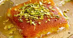 Palestinian cuisine is generally similar to that of neighbouring Jordan. Like in Jordan, mansaf is a popular dish of rice with meat, usually lamb. Knafeh is a popular dessert made of cheese, soaked in a sweet sugar-based syrup and topped with shredded filo pastry. Nablus is famous for their variety of knafeh Nabulsiyeh.