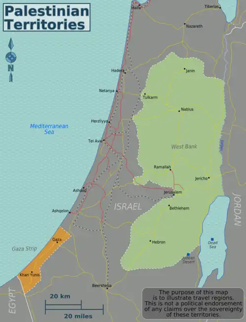 | WARNING: Some western governments have issued a travel warning against travelling to Palestine, due to violent incidents and armed conflict that can occur at any time. Most advise against any travel to the Gaza Strip; some also advise against non-essential travel to the West Bank. | |