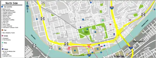 - π Children's Museum of Pittsburgh, 10 Childrens Way, β +1 412 322-5058. Daily 10AM-5PM. A children's museum with a pretty wide variety of great, interactive exhibits, including a recreation of Mister Rogers' Neighborhood, a hall full of optical illusions, a waterplay area, a stage, a workshop full of pulleys and gears, as well as plenty of art and outdoor exhibits. $14 adults, $13 children/teens/seniors, children under 2 free.