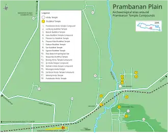 - π Candi Plaosan (About 30 min walk from Candi Prambanan main entrance and 45 min for Bus terminal Prambanan. Part not pedestrian friendly, passing through rice fields. No north east exit from main area (exists but closed) which would make a shorter walk to this temple.). 07:30 - 17:00. This Buddhist temple is about 2 km east of the northern edge of Prambanan park complex and is easily walkable from there. There are two large structures - Plaosan Lor (north) and Plaosan Kidul (south). This complex gives a good insight into the close relationship between Hinduism and Buddhism in 9th-century Java. Buddhist Plaosan was built during the same reign as Candi Loro Jonggrang. The Hindu king at the time had a Buddhist wife. There are some excellent intact reliefs and statues of Boddhisattvas here although most of the statuary was looted long ago. 30- to 60-min visit. Foreigner Rp 50,000, domestic adult Rp 10,000, children Rp 2,000.