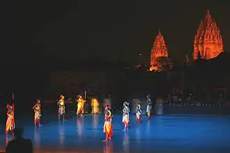 - π Ramayana Ballet Prambanan. An open-air theatre inside the park, just west of Candi Prambanan right across the Opak river, has ballet Javanese dance performances of the great Hindu epic Ramayana on four nights during each full moon between May and October (dry season). The performance involves around 200 artists; dancers and gamelan musicians for about 2 hours, and is performed on Tuesday, Thursday and Saturday nights. This performance, set against the starry sky and the lit backdrop of Prambanan with new LED lighting, is quite spell-binding. Enquire at travel agents locally or at your hotel for tickets and times. During the rainy season (November to April) the performance is held in the smaller indoor Trimurti theatre. The ticket price in 2015 wass between Rp 100,000 to Rp 350,000.