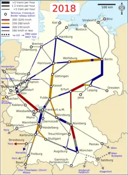 - InterCity Express (ICE) trains. High speed trains capable of speeds up to 320 km/h (200 mph). The condition of tracks and signals however allows top speeds of only 160 km/h (99 mph) on unmodified legacy tracks, 200 km/h (120 mph) on routes with special electronic equipment called "Ausbaustrecke" (the Berlin Hamburg railway is an Ausbaustrecke built for 230 km/h (140 mph)), or 250 km/h (160 mph) to 300 km/h (190 mph) on designated high-speed tracks called "Neubaustrecke". The top speed of 320 km/h (200 mph) is reached on the journey from Frankfurt to Paris, France. Although significantly faster than by road, they can also be expensive, with a 1-hour-trip (Frankfurt to Cologne, around 180 km) costing up to €67 one-way ("Flexpreis", i.e. walk up fare without any discount). However when you book the ticket in advance and are a bit flexible with hour and date of travel, you can get a considerable discount. All domestic ICEs are electric. There are several different types of ICE, but they are all fairly similar to one another and only distinguishable for non-enthusiasts by their top speed and age. One notable difference is the ICE 4 which was introduced into regular service in December 2017 and is the only ICE which carries bicycles. The order for the ICE 4 was one of the biggest in DB history and it will take into the mid 2020s before all ordered trains enter service.