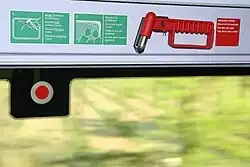 In the unlikely event of an accident the doors may be impassable or not within reach. You can create other escape routes by breaking the windows. This is usually done by hitting the small red dot on top of the window with the red hammer. You can then safely remove the broken window. Make sure that the drop is not too deep before you exit the train.