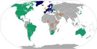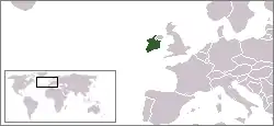 Visa policy of Ireland. Countries in blue, green, and yellow can enter the country without a visa.