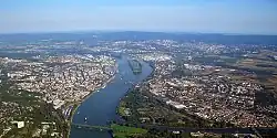 - Koblenz, the confluence of Rhine and Moselle (the name Koblenz is derived from the word "confluence") is called Deutsches Eck ("German corner") and considered to be a symbolic place of this nation. There is a larger-than-life equestrian statue of German Emperor William I (the first ruler after the German unification of 1870/71) right on the point between the two rivers. Exactly opposite is the massive Ehrenbreitstein fortress. Terminus of the regional trains from Mainz. From here hourly regional express trains follow the Rhine all the way to Emmerich on the German-Dutch border (via Bonn, Cologne, Düsseldorf, Duisburg). If you prefer to travel more slowly, take the regional train Koblenz–Cologne that stops at every station.