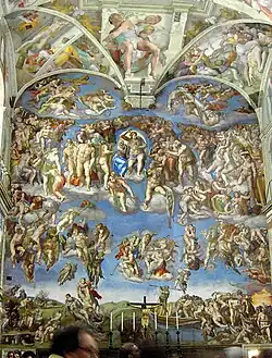 - The Sistine Chapel is a rectangular brick building with no exterior decoration. There is no exterior entrance, it being approached from within the Vatican buildings. Inside, the walls are divided into three levels. The lower is decorated with frescoed wall hangings. The middle of the walls has two cycles of paintings, "The Life of Moses" and "The Life of Christ", painted by Ghirlandaio, Botticelli, Signorelli, Pinturicchio and Perugino, among others. The upper tier contains a Gallery of Popes. Around the tops of the windows are the "Ancestors of Christ", painted by Michelangelo as part of the ceiling. The ceiling proper contains nine paintings inspired by the Old Testament, showing God's Creation of the World, God's Relationship with Mankind, and Mankind's Fall from God's Grace. Michelangelo was reluctant to work on the ceiling but was unable to refuse an instruction by a pope, Julius II. He worked on it between May 1508 and October 1512, which included a one-year period when he did little work. Given that most of the painting was done by Michelangelo himself, rather than his pupils, completing it in such a short period was an amazing achievement. The ceiling had to be worked on piece by piece as frescoes require painting when the plaster is still damp and most of the time Michelangelo was lying on his back in considerable discomfort.