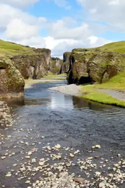 Continuing the journey, just after the junction to route 209, you will see multiple small cairns made from rocks on the left. This spot, named Laufskálavarða, is named as such because of an old tradition of wishing one good luck on a trip by building these cairns. Though taking pictures of them are fine, do not make a new one or move any!. Not long thereafter, a detour to route 206 leads to the Fjaðrárgljúfur, a 100m deep canyon in which one can look at it from either up the hill or from the river down the trail. Another 20 minutes down the road is the town of Kirkjubæjarklaustur. Accessible from the town is Systrafoss, a double waterfall whose water falls sloping instead of steeply.