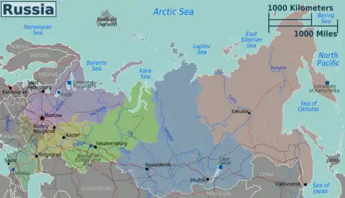 | Russian Far East (Amur Oblast, Chukotka, Jewish Autonomous Oblast, Kamchatka Krai, Khabarovsk Krai, Magadan Oblast, Primorsky Krai, Sakhalin Oblast, Yakutia) One of the coldest regions in Russia, home to the coldest city in the world, Yakutsk. World-famous for national parks, beautiful scenery and mountains, and the volcanoes of Kamchatka. Also a gateway to North Korea and China. |