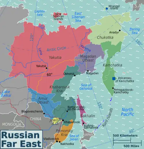 The Far Eastern Federal District or Far Eastern Russia (Russian: Да́льный Восто́к Росси́и, DAHL'-nih vah-STOHK rah-SEE-ee) is the easternmost part of Russia or unofficial edge of the world, comprising a third of the country's land area, with 6.3 million inhabitants.