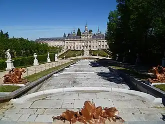 - 🌍 Royal Palace of La Granja de San Ildefonso, Real Sitio de San Ildefonso, ☏ +34 921 470019. Tu-Su 10:00-18:00. This was a monastery farm until 1719, then Philip V acquired it and built a summer palace when his Valsain palace burned down. As a Bourbon he was much influenced by Versailles, and what started as a modest rural retreat burgeoned into a bling palace and political power centre. The village of San Ildefonso swelled with it, with barracks, lodgings for courtiers, a church, and an entire glass factory to produce the necessary amount of glass. La Granja fell out of fashion in the 1880s and suffered a fire in 1918. It's surrounded by vast gardens in 18th-century French manner. Adult €9, conc €4.