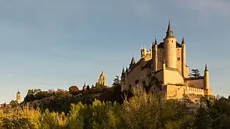 - 🌍 Alcázar, Plaza Reina Victoria Eugenia, ☏ +34 921 210515. Daily Apr-Oct 10:00-20:00, Nov-Mar 10:00-18:00. Dramatically sited at the west edge of the crag of Old Town, this was built around the 11th century, with the current facade added by Phillip II. The interior is decorated in a hotchpotch of Romanesque, Gothic, Mudejar, and Renaissance. It's variously hosted the royal court of the Trastamara Dynasty, Isabella the Catholic, the wedding of Phillip II, and the Spanish Artillery Academy. The ticket includes the Palace, Artillery Museum and Tower of Juan II. The resemblance of its witches-hat towers to Disney Castle is no accident, and scenes from Orson Welles' Chimes at Midnight were filmed here. Adult €10.