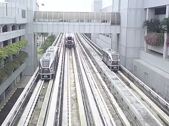 Changi Airport is the terminus of the East-West line of the Mass Rapid Transit (MRT) rail system. While cheap, the MRT is aimed squarely at commuters: there are no express services; the trains are regular commuter trains without baggage storage (although many of the train sets have handrails installed in place of seats in order to accommodate more standing passengers with luggage), and can get quite crowded during rush hour (mornings towards the city, evenings towards the airport). But if you're not in a rush, don't have too much luggage or are staying near a station, the train can still be worthwhile.