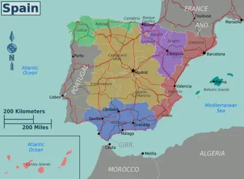| Spanish North Africa (Ceuta, Melilla, Crag of Vélez de la Gomera, Crag of Alhucemas, Chafarinas Islands, Alboran Island) Spanish exclaves along the coast of Morocco. |