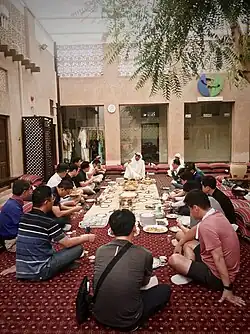 In public, general global and mostly western etiquette is required to be adhered. If you are invited to an Emirati's house for food, it depends on how cultural the family is. You may be required to sit on the ground, eat with your hands, or share the same plate with everyone. It is not uncommon for Emiratis to present a feast in one big platter, and everyone sits around it and eats with their hands. The key thing to remember when doing so is to use only your right hand, as the left hand is traditionally reserved for handling dirty things. Being invited to break bread or share a platter with Emiratis is a considered a huge sign of respect and fondness. Young Emiratis are however, very understanding if you choose to have your own plate or eat with utensils, and some Emiratis don't even adhere to the traditional floor sitting and eating with hands style of cultural eating etiquette. A more modern etiquette is to sit on the ground with everyone having their own plate, spoon, fork, and knife while eating the food in front of you or politely asking someone next to you to serve the food away from you. Do not get up and attempt to move to the place where a certain type of food is placed.