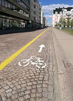 Another model (common in, e.g., Finland) is that half the pavement is for bikes. The dividing line is not always respected and one often has to slow down at crossings and at pedestrian congestions. The bike lane can be bidirectional. Look out for people stepping out from buses (and those suddenly crossing the biking lane to stop one). Although turning cars should yield, a fast approaching bike is not always noticed in this arrangement. On the other hand, the slower biking speeds, and not having a car behind at crossings, can be more child-friendly.