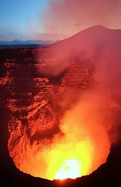 - 🌍 Mount Nyiragongo. An active volcano in Virunga National Park in the far eastern D.R. Congo, near Goma and the Rwandan border. One of just four volcanoes in the world with a persistent lava lake, the others being Erta Ale (Ethiopia), Kilauea (Hawaii), and Mount Erebus (Antarctica). The volcano is usually accessed by overnight hike (8–10 hr up first day, hike down the following morning), with the night spent in tents on the rim of the caldera with stunning views of the lava lake and the surrounding region. Unfortunately, it is located in a conflict zone and access is occasionally blocked due to the presence of rebels and criminal gangs. It is a Decade Volcano.