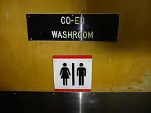 Depiction of a man and a woman standing, sometimes separated by a divider (but see usage notes).