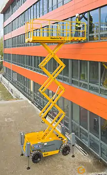- A device for raising people and/or equipment by means of a bucket or platform attached to a boom or expanding scissors-style supports.