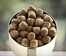 - (cooking) A minced, cooked food (usually meat or vegetables), which is deep-fried in fat and sometimes sprinkled with breadcrumbs.