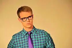 - He was wearing hipster glasses, jeans, a red-and-white striped shirt, and red sneakers.