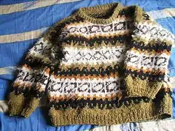 - sweater, jumper, jersey, pullover; cardigan (a knitted or crocheted garment, either pulled over the head (pullover) or open at the front (sweater))