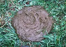 From koe (“cow”) + vlaai (“a type of flat fruit pie”). Named after the typical shape of the excrement.
