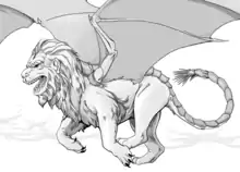 Borrowed from Latin mantichōra, from Ancient Greek μαρτιχόρας (martikhóras, “man-eater; tiger”), from Old Persian 𐎶𐎼𐎫𐎡𐎹 (*martiya, “man, human being, mortal”) + 𐎧𐎺𐎠𐎼 (*χvāra, “eater”).