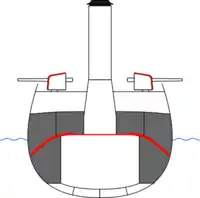 A cross-section of a protected cruiser, showing the armored deck and gun shields (in red).