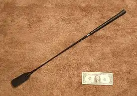 a 30 inch (760 mm) riding crop, with a 16 cm US dollar bill to show scale