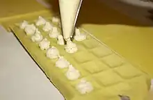 - pastry bag, piping bag (a cloth bag shaped like a cone with a small hole at the tapered end, used with a metal or similar nozzle for squeezing out decorative icing and other pastes in cooking)