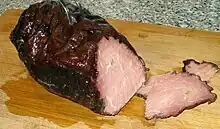 - (food) a dish of Norrlandic origin consisting of frozen meat (usually moose) roasted at a low temperature for around 10-12 hours and then marinated in a seasoned brine, somewhat similar to roast beef [since 1983]
