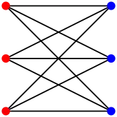 - (graph theory) The graph K3,3, which has six vertices in two sets of three and nine edges such that every vertex in one set is connected to each vertex in the other.