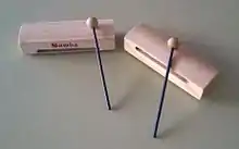 - (music) A percussion instrument consisting of a hollow block of wood struck with a drumstick.